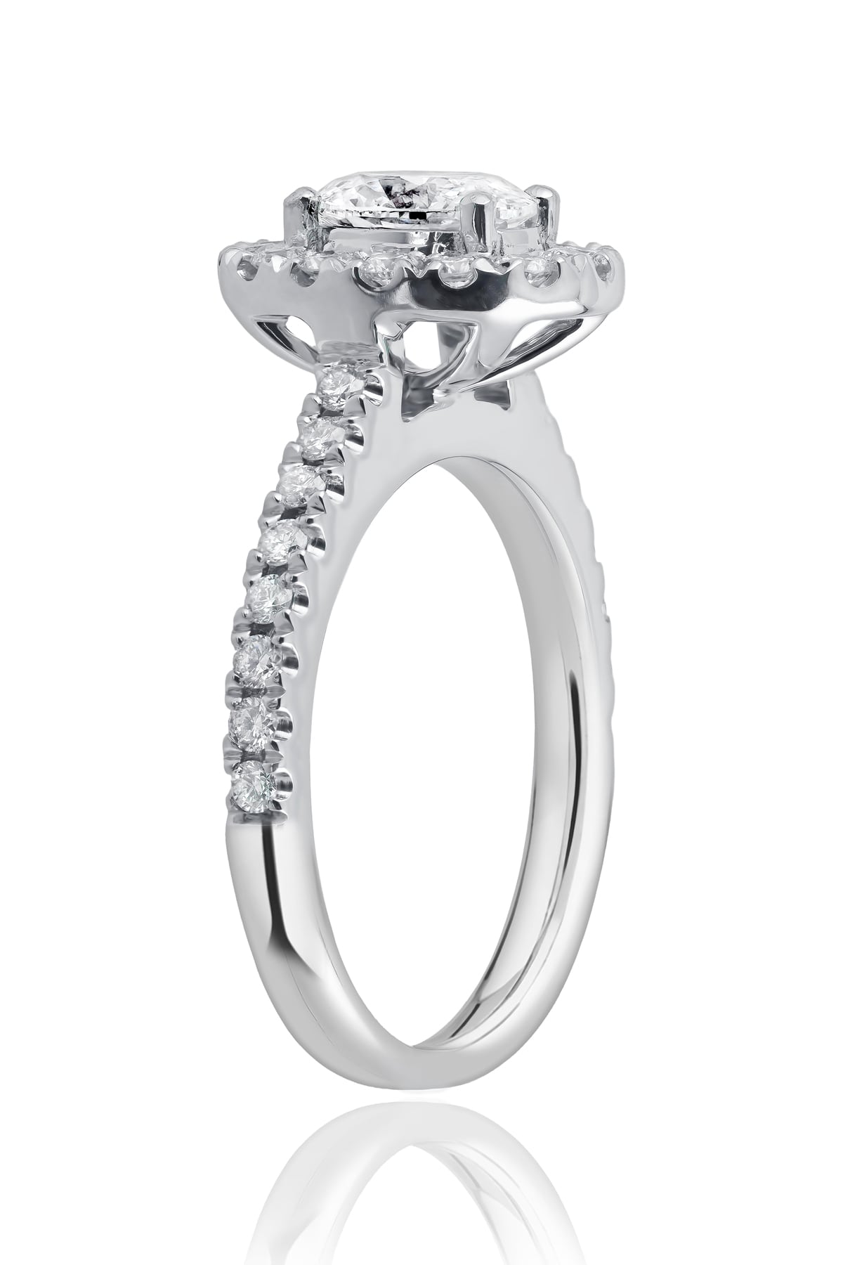 Elegant and full of brilliance, this 18ct white gold halo ring showcases a stunning 0.70ct oval diamond in F SI1 quality, certified by GIA (Report #7401453957). The centre diamond is beautifully highlighted by a halo and band set with 30 round brilliant cut diamonds totalling 0.45ct, also in bright F SI quality. The result is a refined, radiant design that enhances the size and sparkle of the central stone, offering timeless sophistication from every angle.
