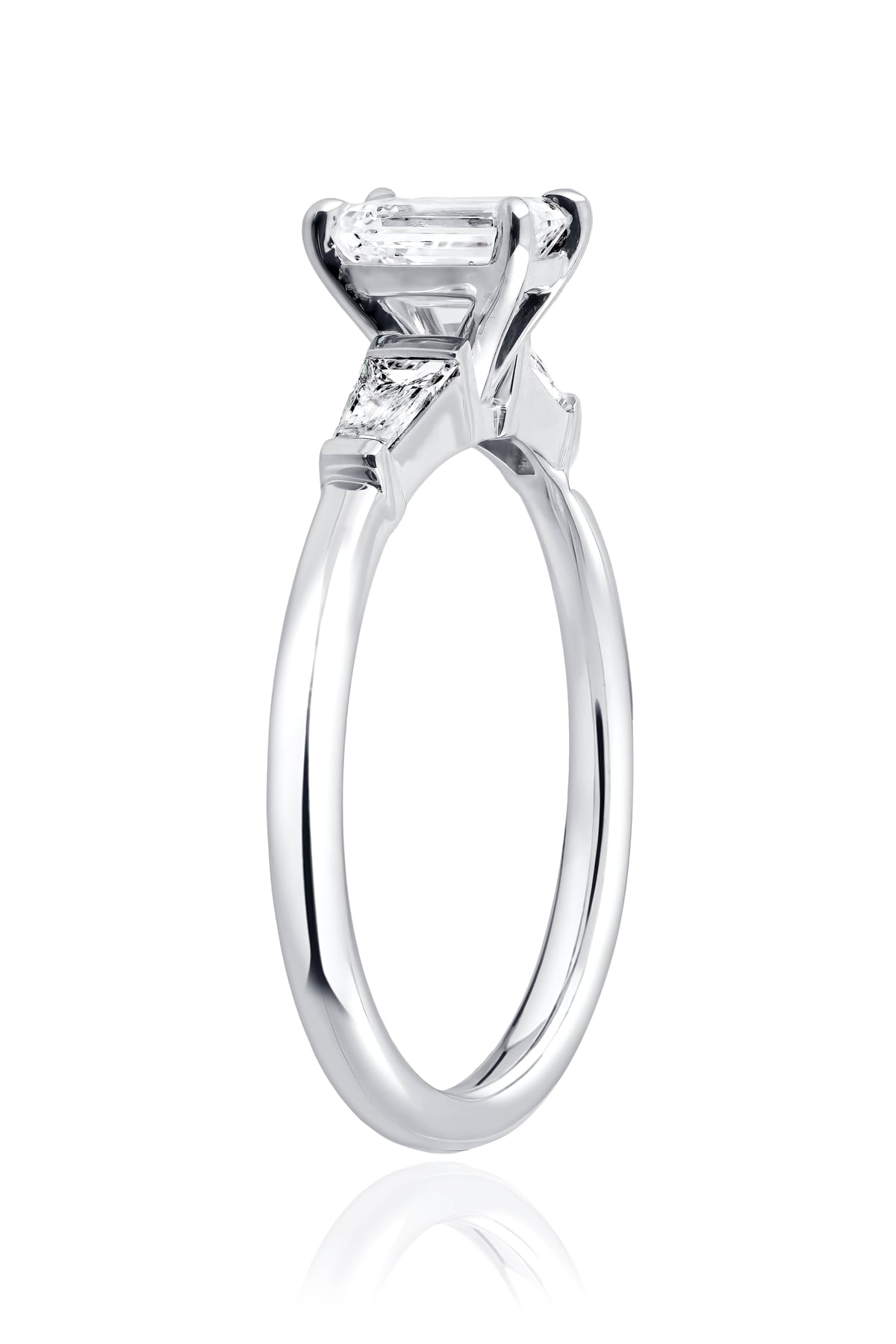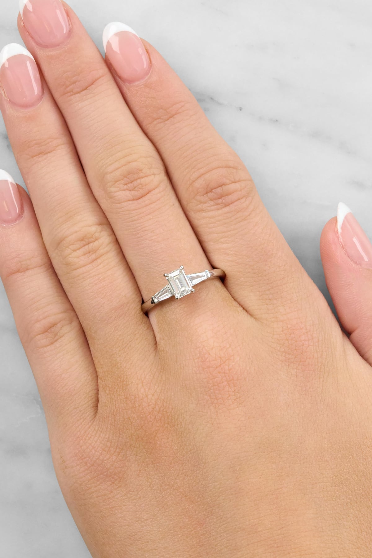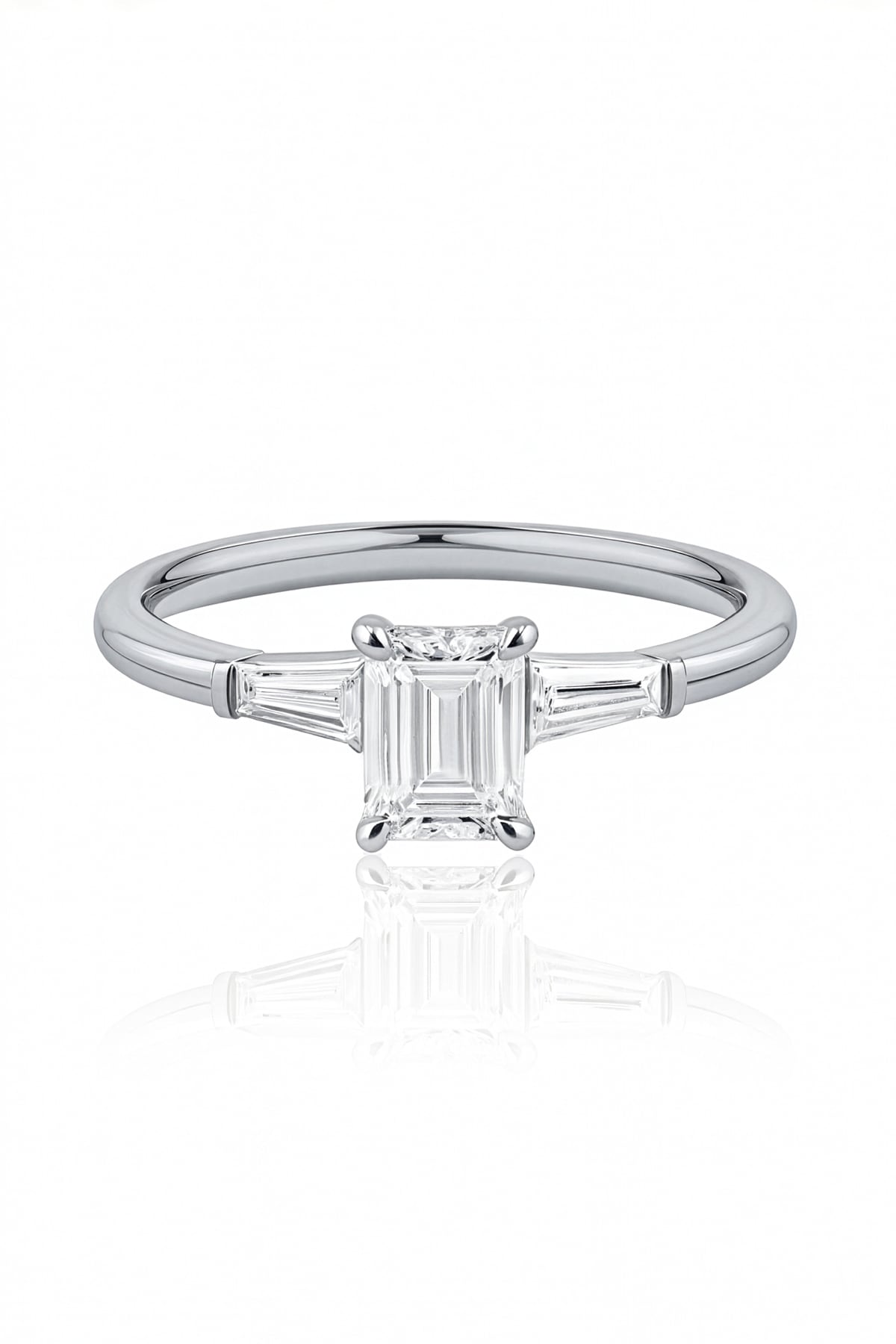 Timeless and sophisticated, this 18ct white gold ring features a striking 0.70ct emerald cut diamond in H SI1 quality, certified by GIA (Report #5463406028). The clean lines of the emerald cut are beautifully complemented by two tapered baguette diamonds totalling 0.23ct, adding subtle brilliance and enhancing the ring’s refined, architectural look. Elegant and understated, this design is perfect for lovers of classic style with a modern edge.
