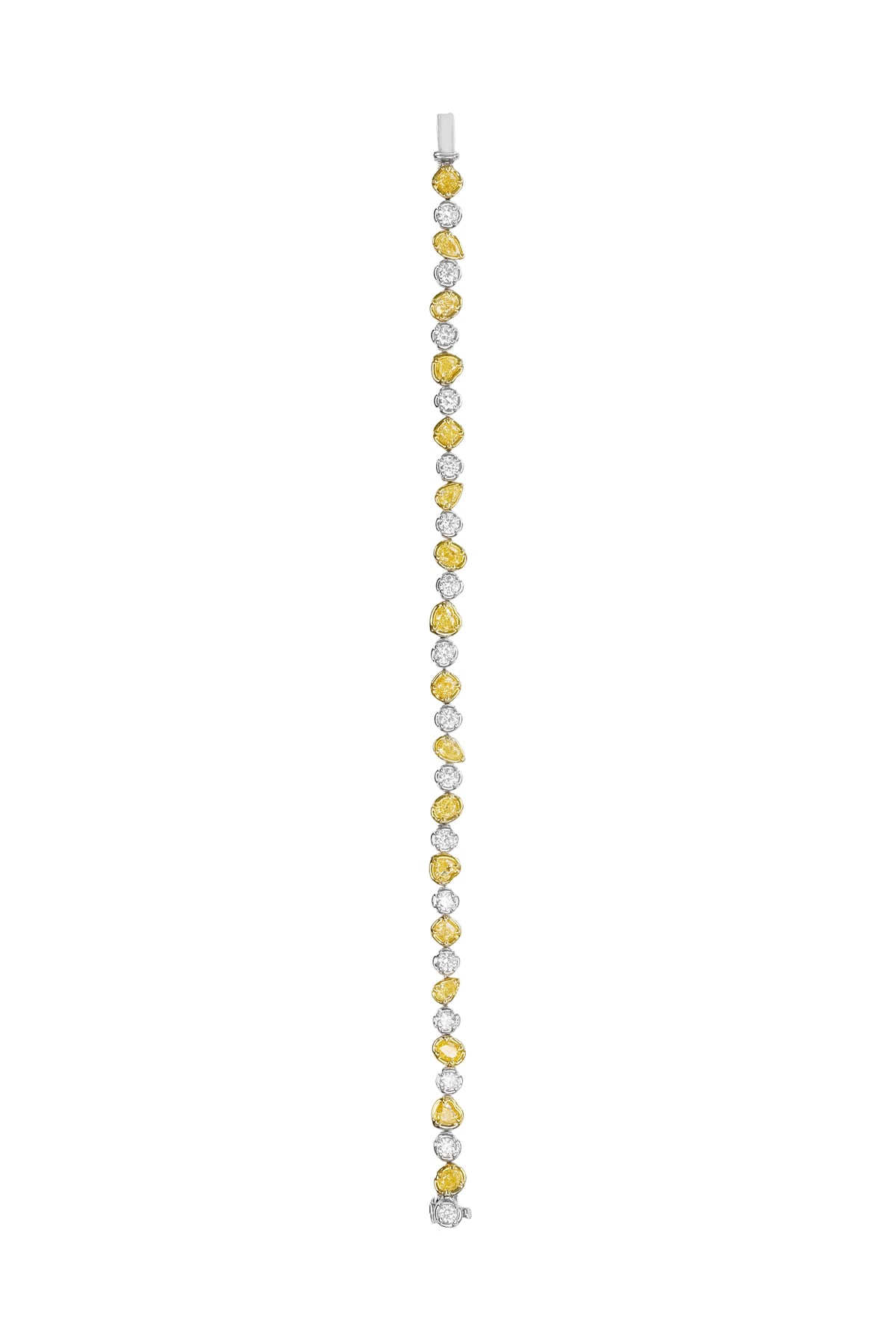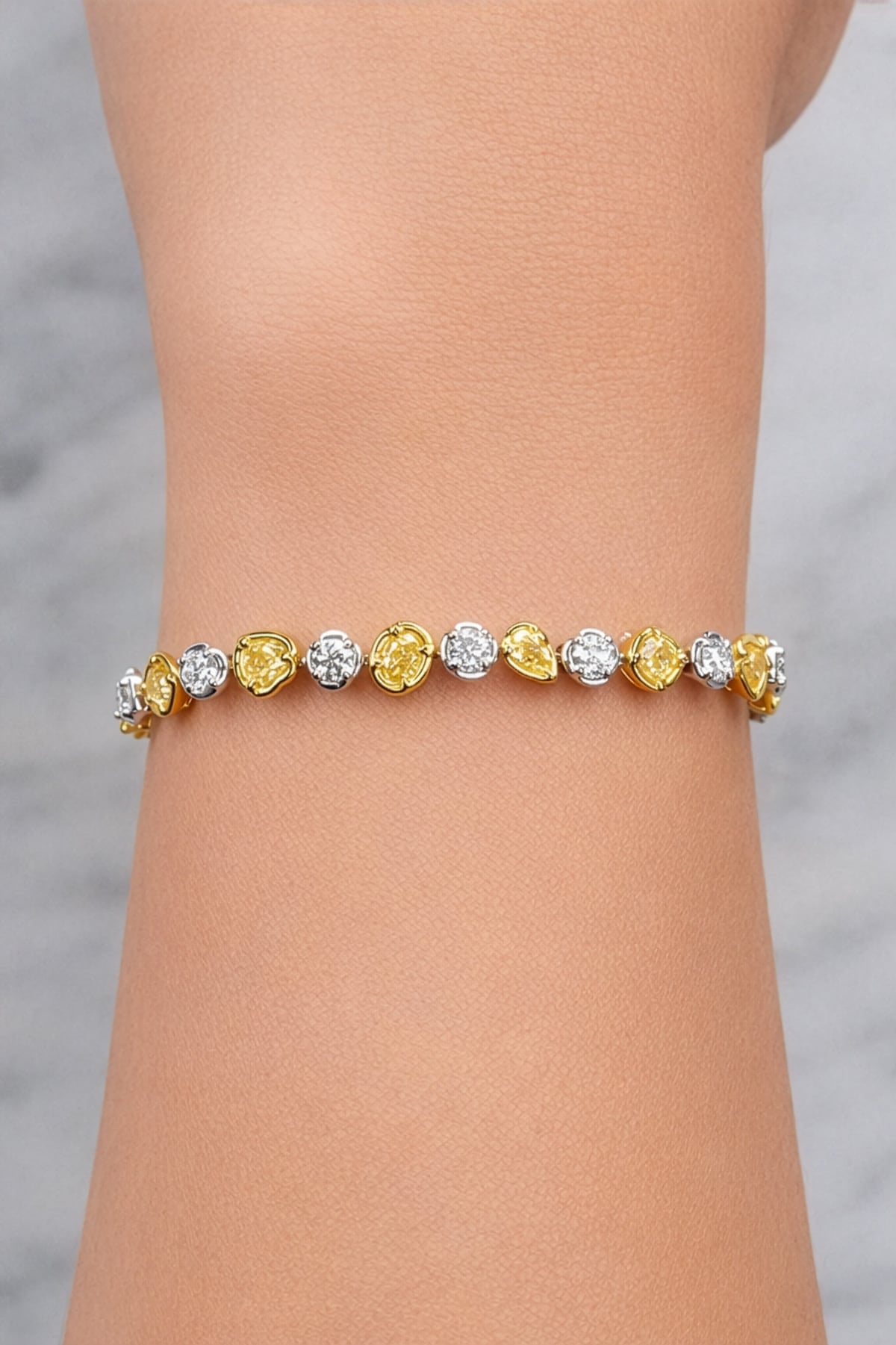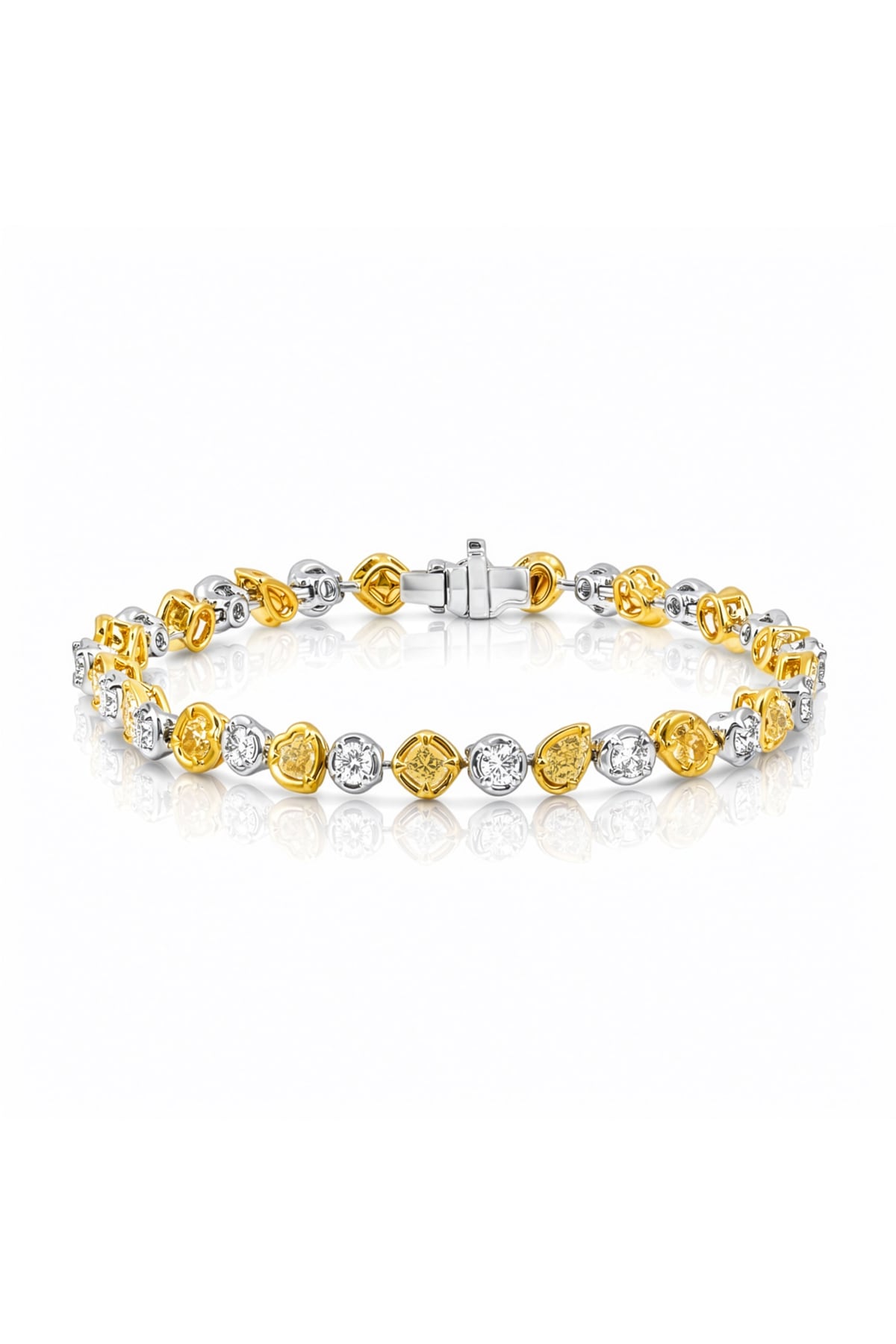 Exquisite and truly one of a kind, this 18ct yellow and white gold tennis bracelet showcases a captivating mix of fancy yellow and white diamonds in an elegant, flowing design. Featuring a beautiful selection of diamond shapes including round brilliant, cushion, heart, oval, and pear cuts, each stone has been carefully chosen to create depth, contrast, and exceptional sparkle. With a total diamond weight of 4.56ct, this bracelet is a luxurious statement piece that celebrates colour, craftsmanship, and refined elegance.