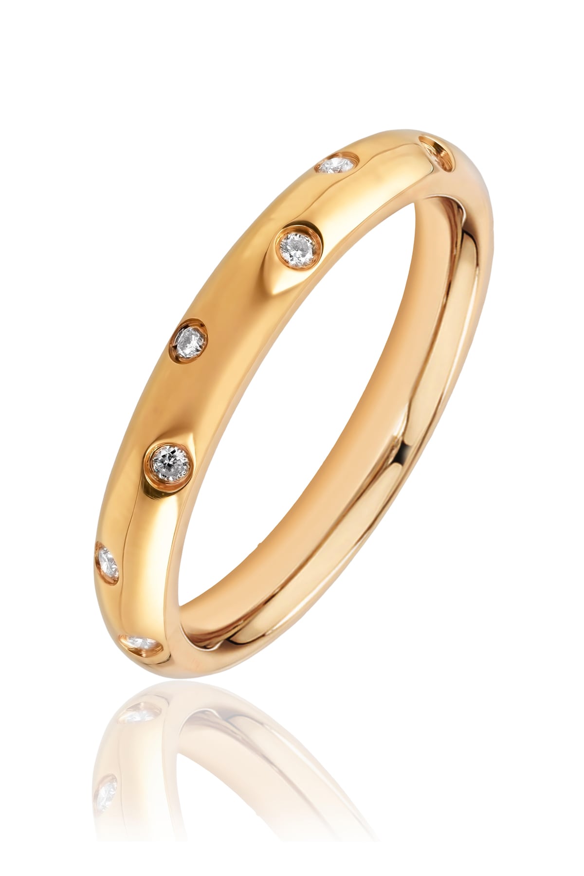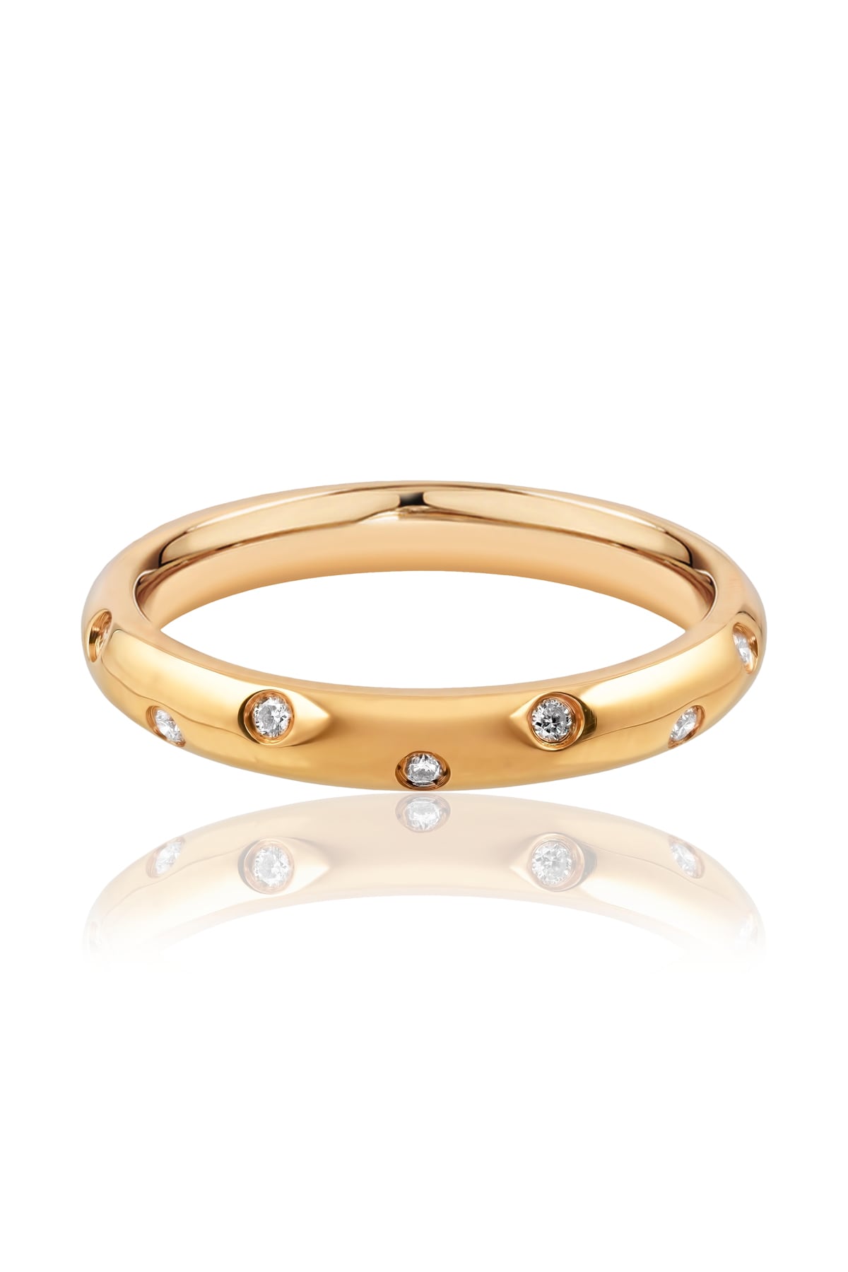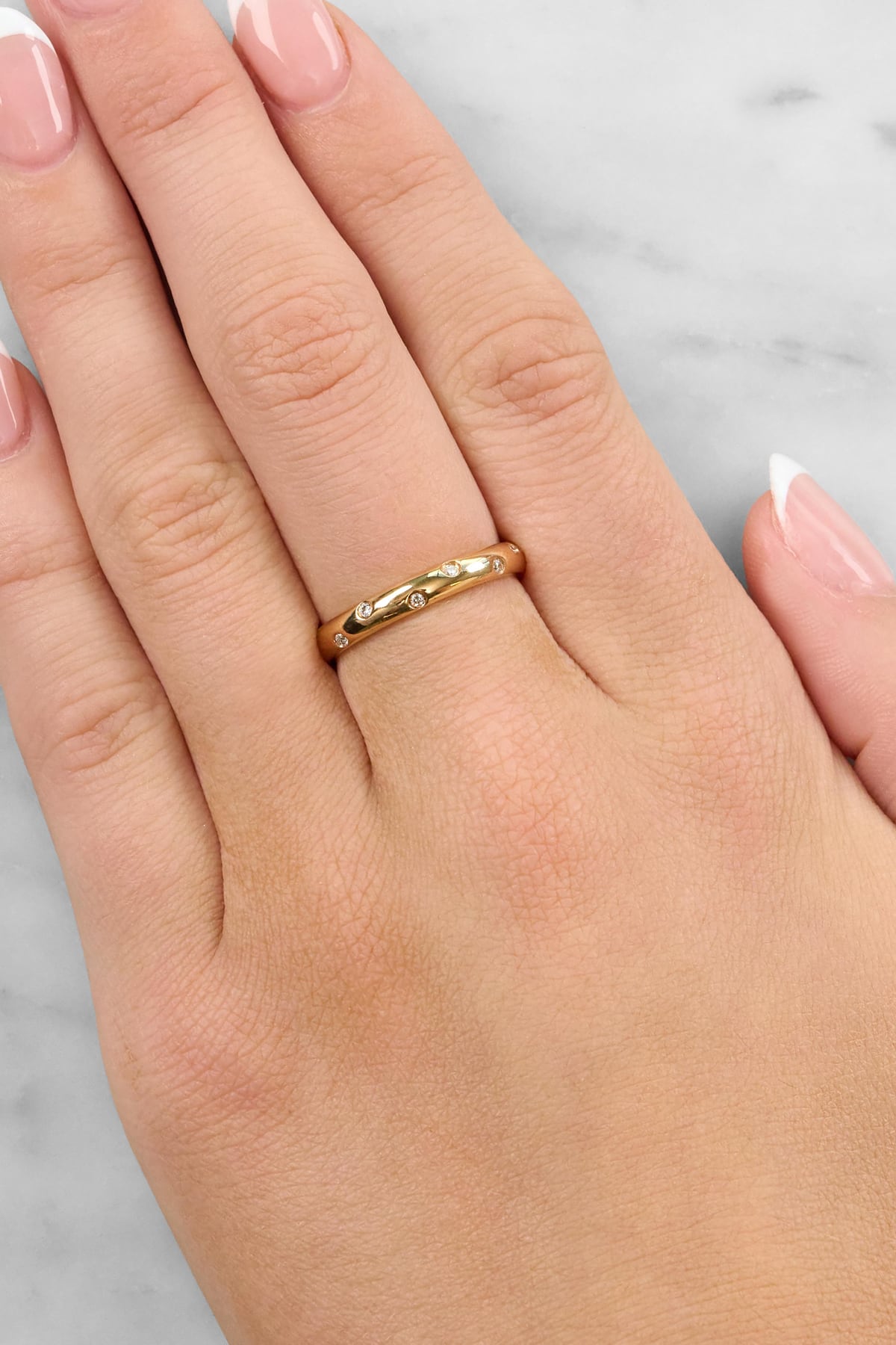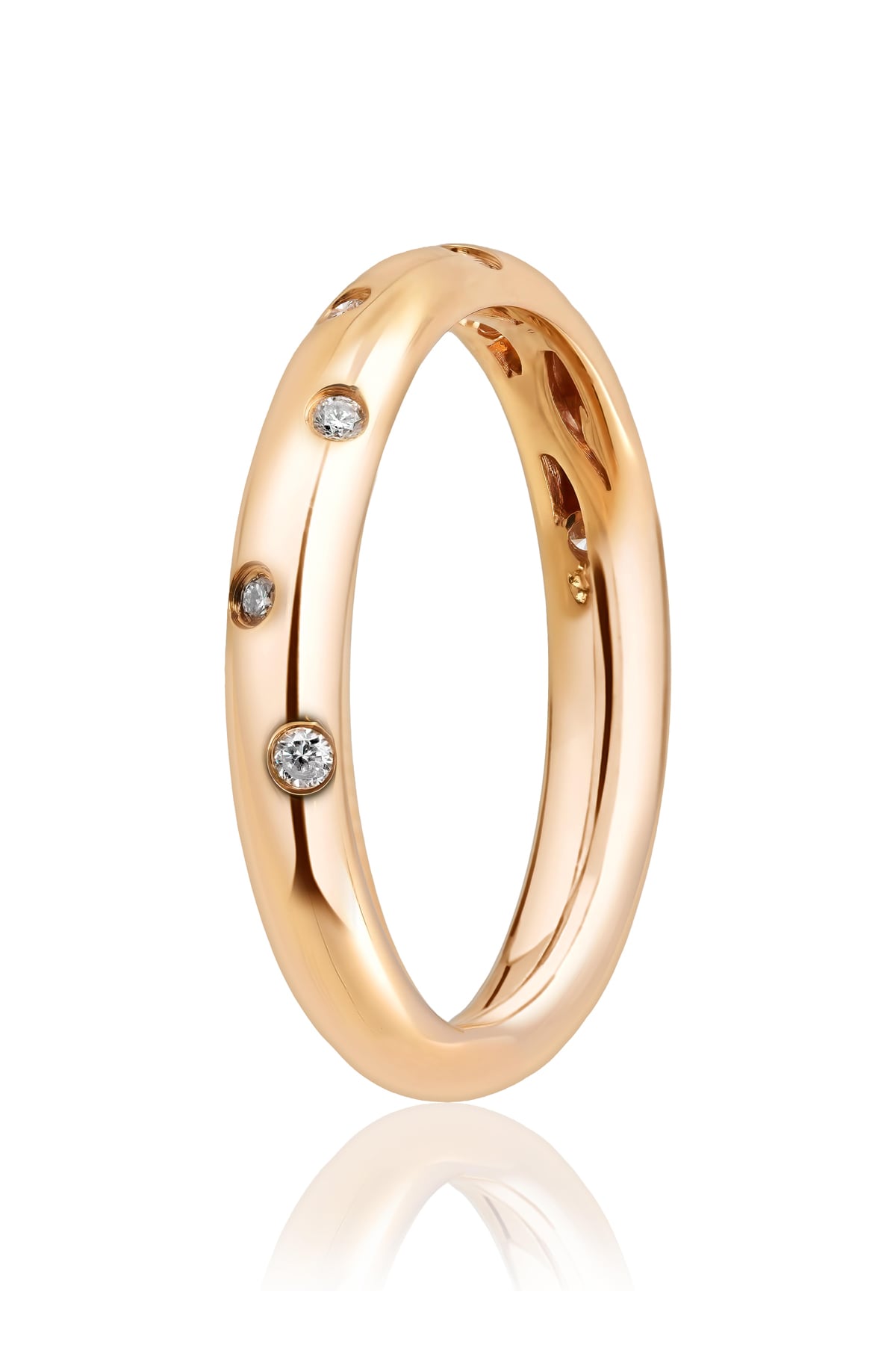 Modern, refined, and effortlessly elegant, this 18ct rose gold ring features eight round brilliant cut diamonds totalling 0.09ct. Each diamond is securely hammer set, creating a smooth, contemporary look while still offering a subtle sparkle. The warm tones of rose gold paired with the soft brilliance of G SI diamonds make this a beautiful piece to wear on its own or stack with your favourite rings.