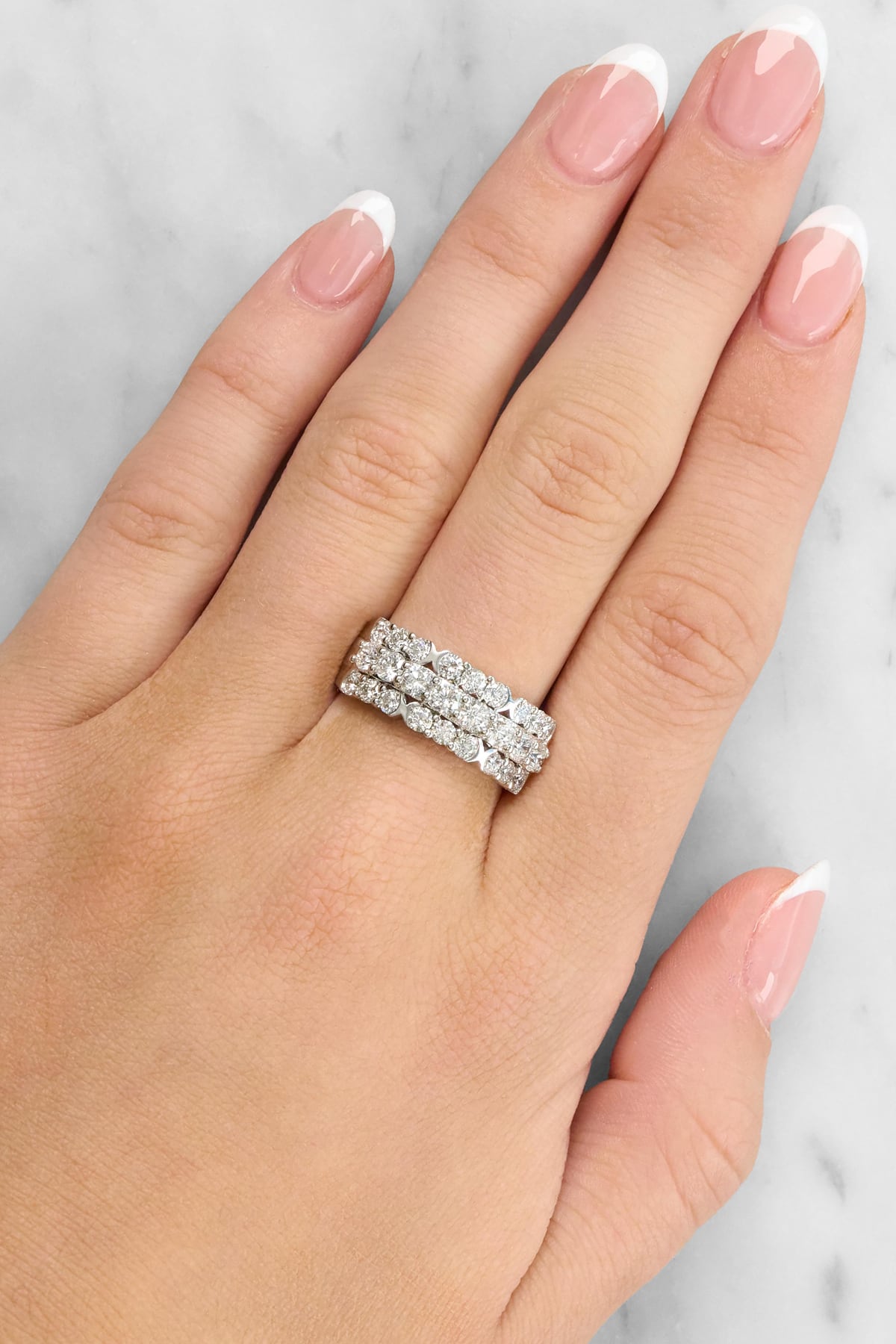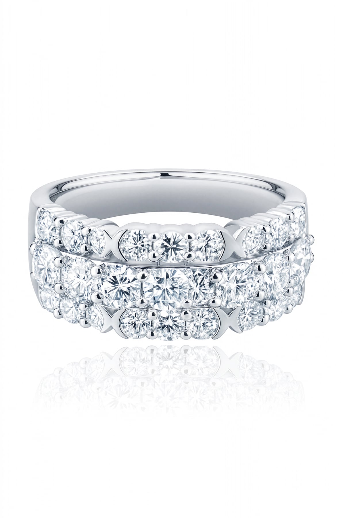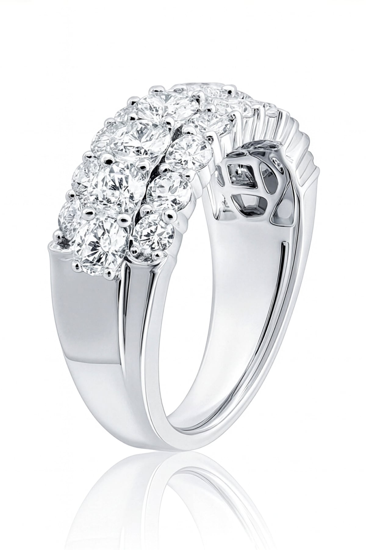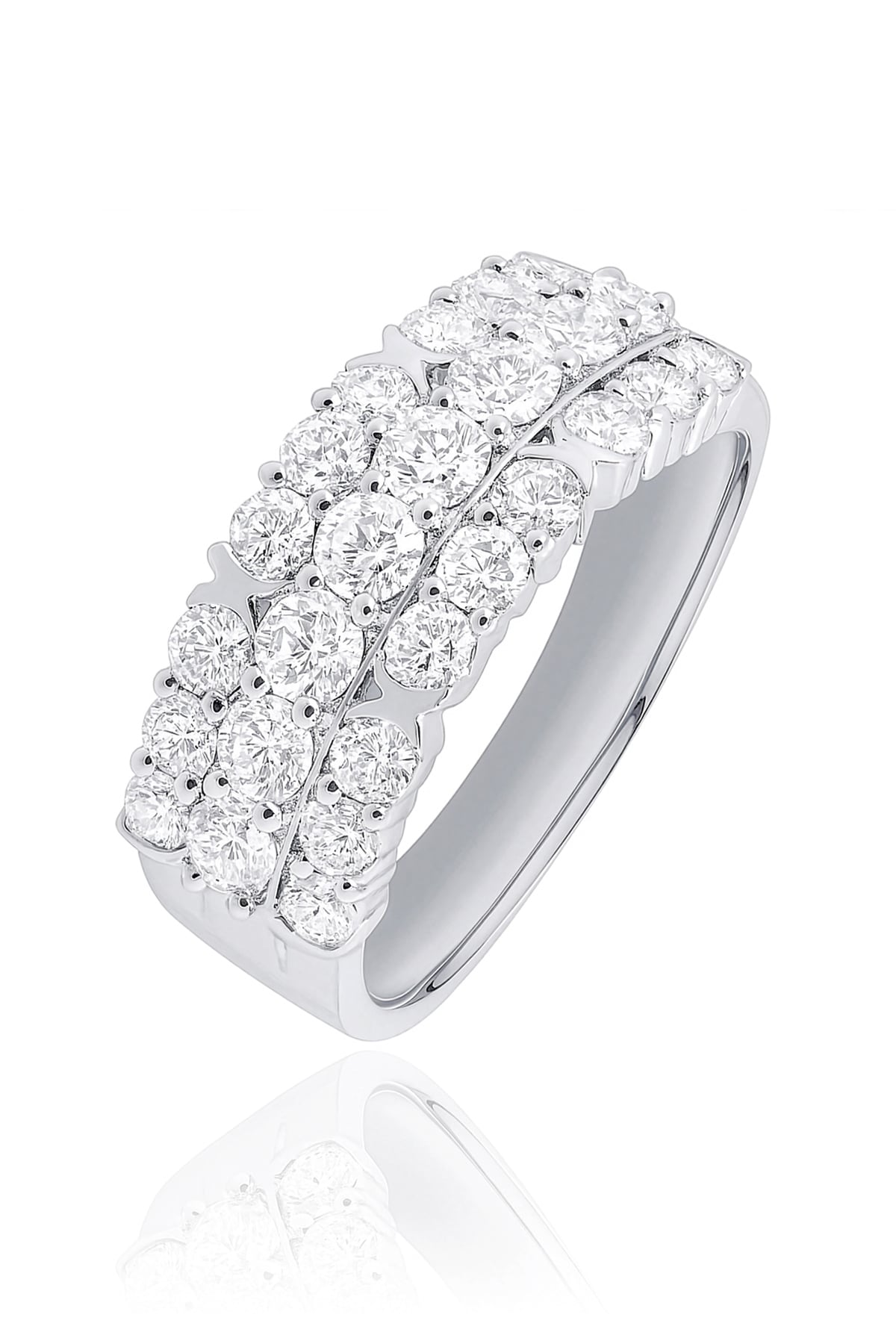 Bold, luxurious, and full of sparkle, this 18ct white gold ring features three dazzling rows of diamonds for an eye-catching statement. Set with 26 round brilliant cut diamonds totalling 1.72ct in bright G SI quality, the wide design creates a beautiful display of light across the finger. Elegant and modern, this piece is perfect for those who love a ring with presence and timeless sophistication.