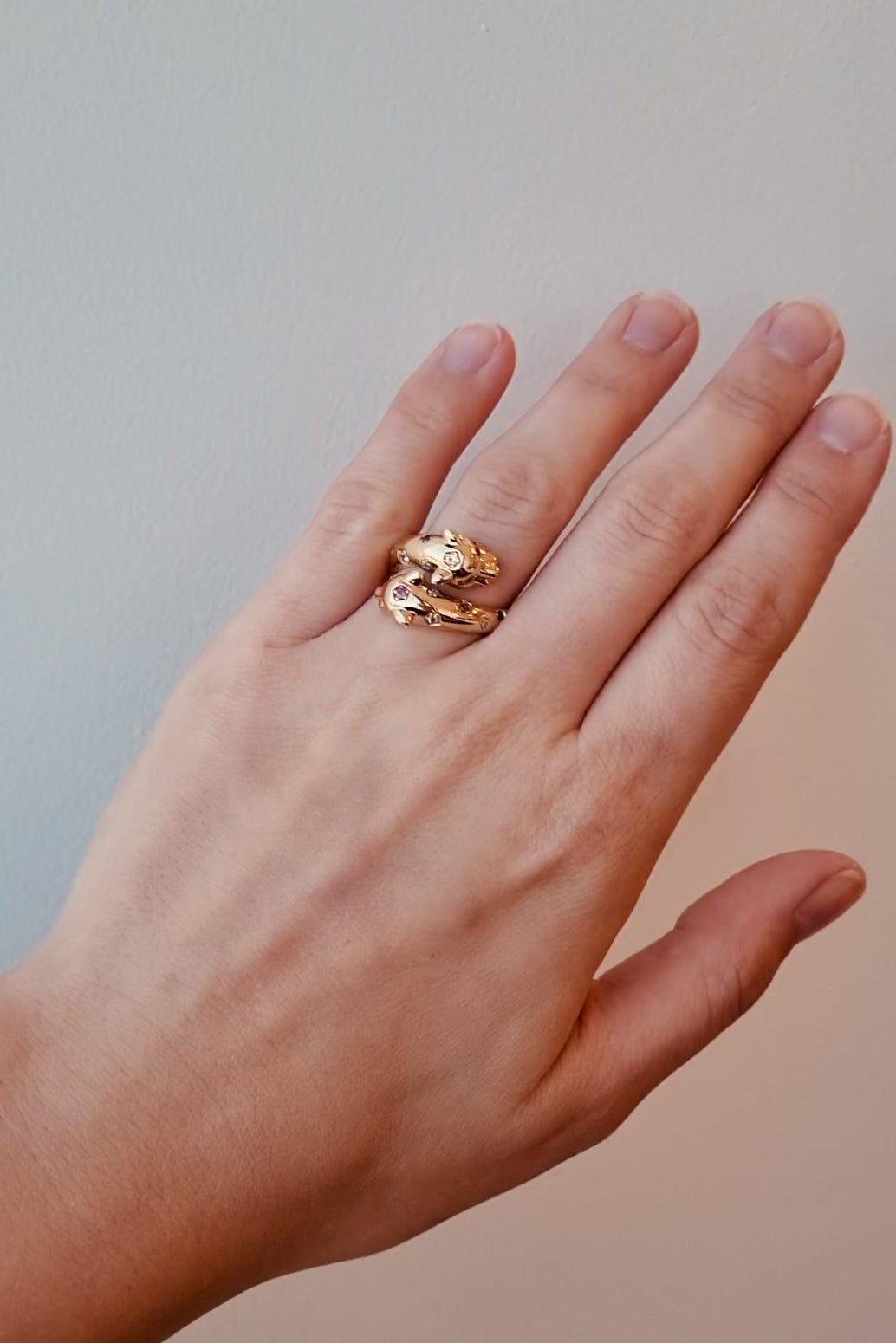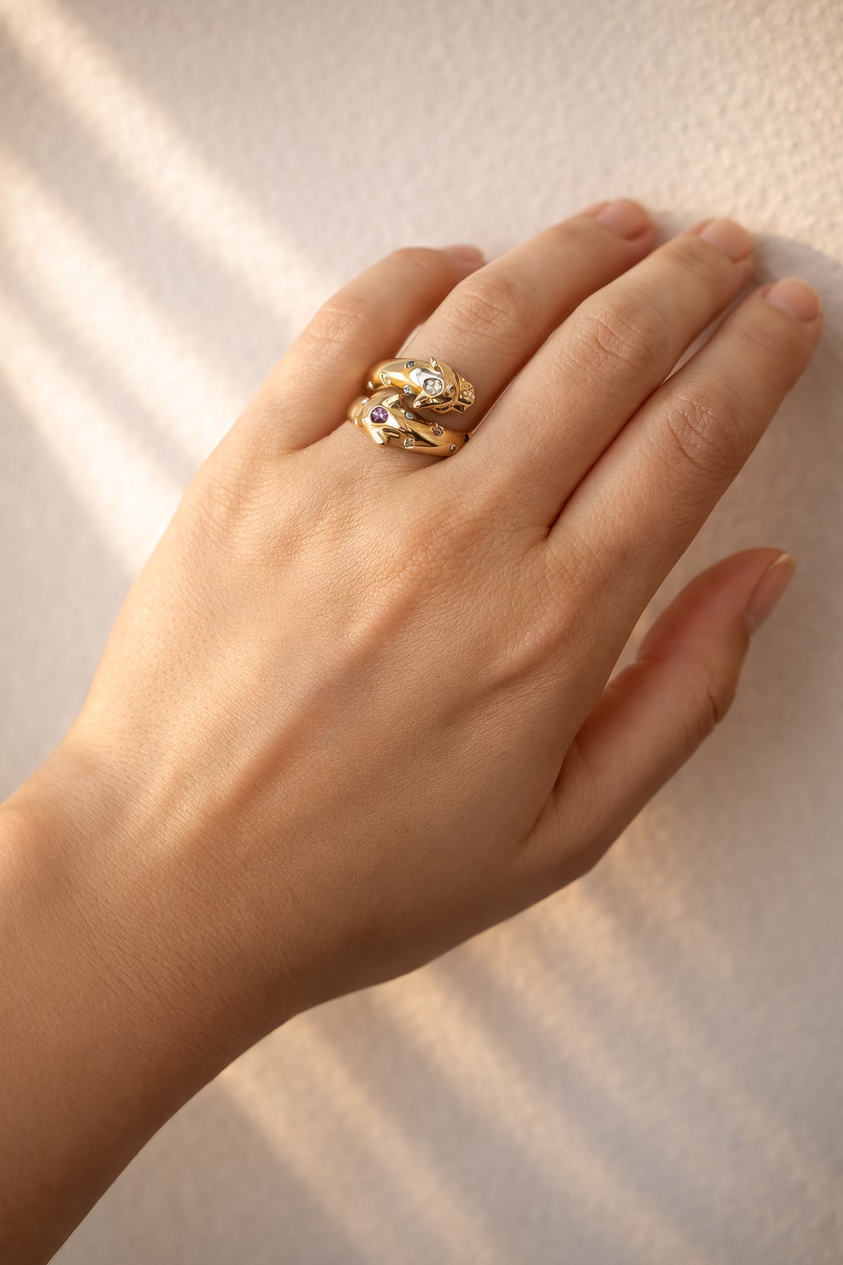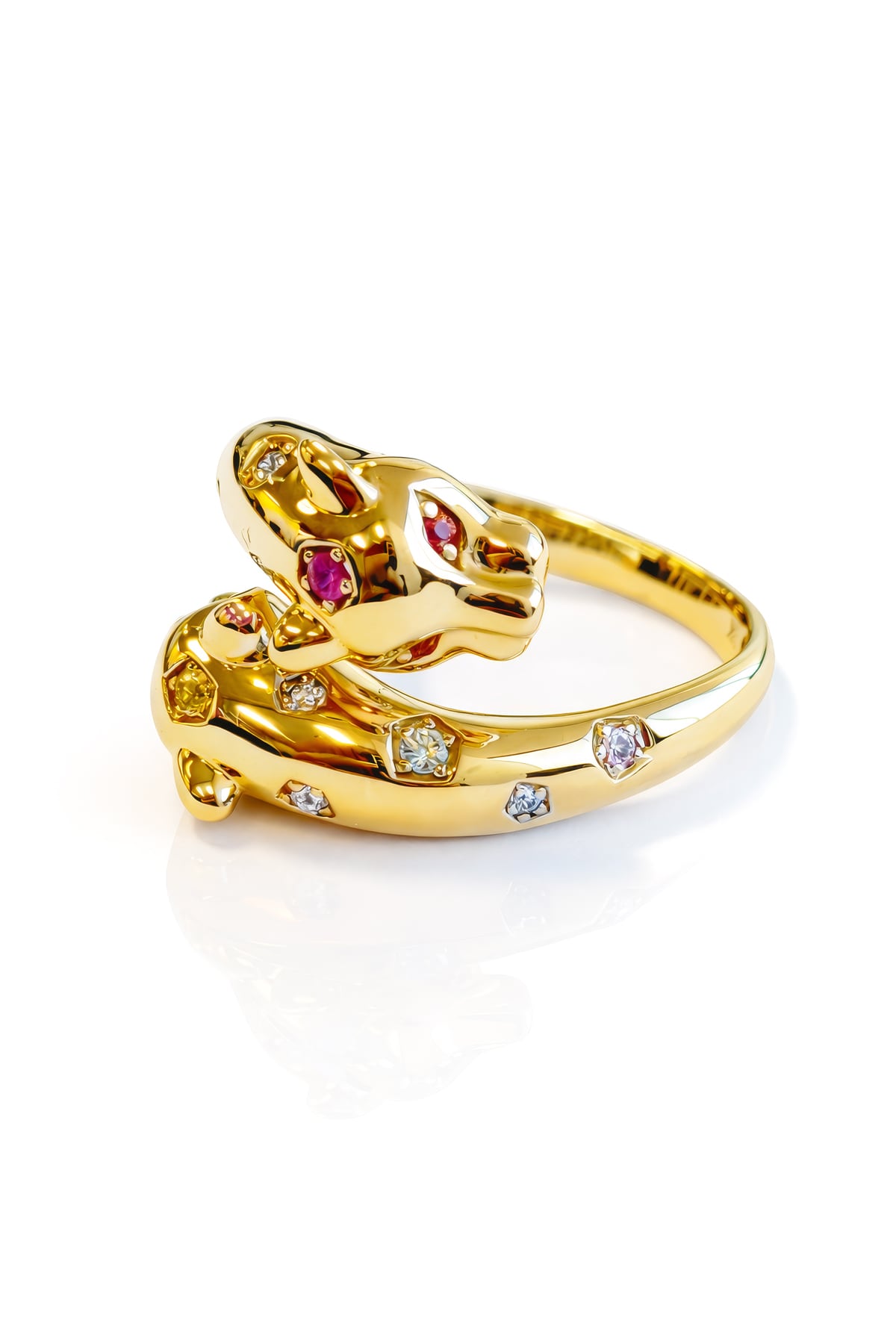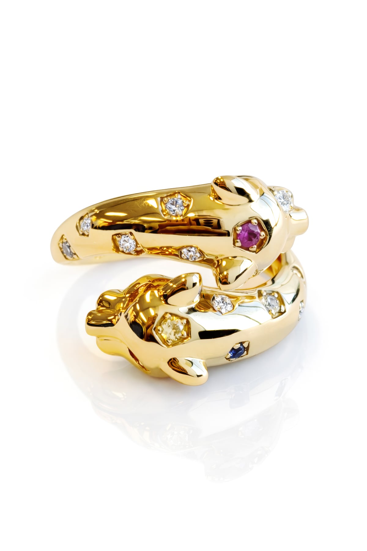 Playful, bold, and beautifully crafted, this 18ct yellow gold leopard style ring is full of personality. Inspired by the strength and elegance of the leopard, the design is set with 12 multi-coloured sapphires totalling 0.26ct, adding vibrant flashes of colour throughout the piece. Six round brilliant cut diamonds totalling 0.04ct provide a subtle touch of sparkle, bringing light and contrast to the detailed gold work. A statement ring with character, perfect for those who love distinctive jewellery with a creative edge.