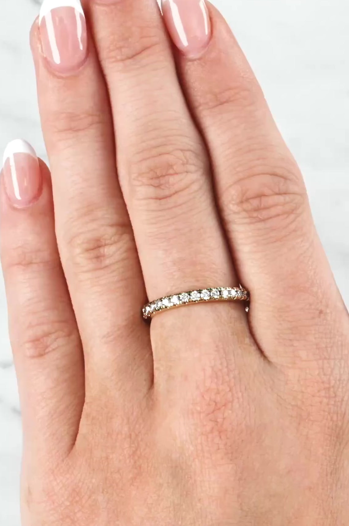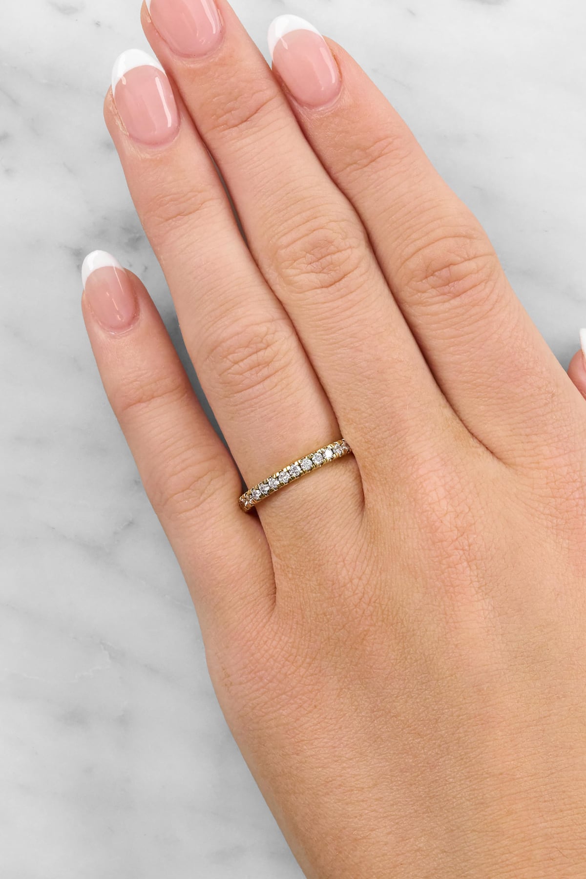 Lady wearing a Claw Set Diamond Band In 18ct Yellow Gold