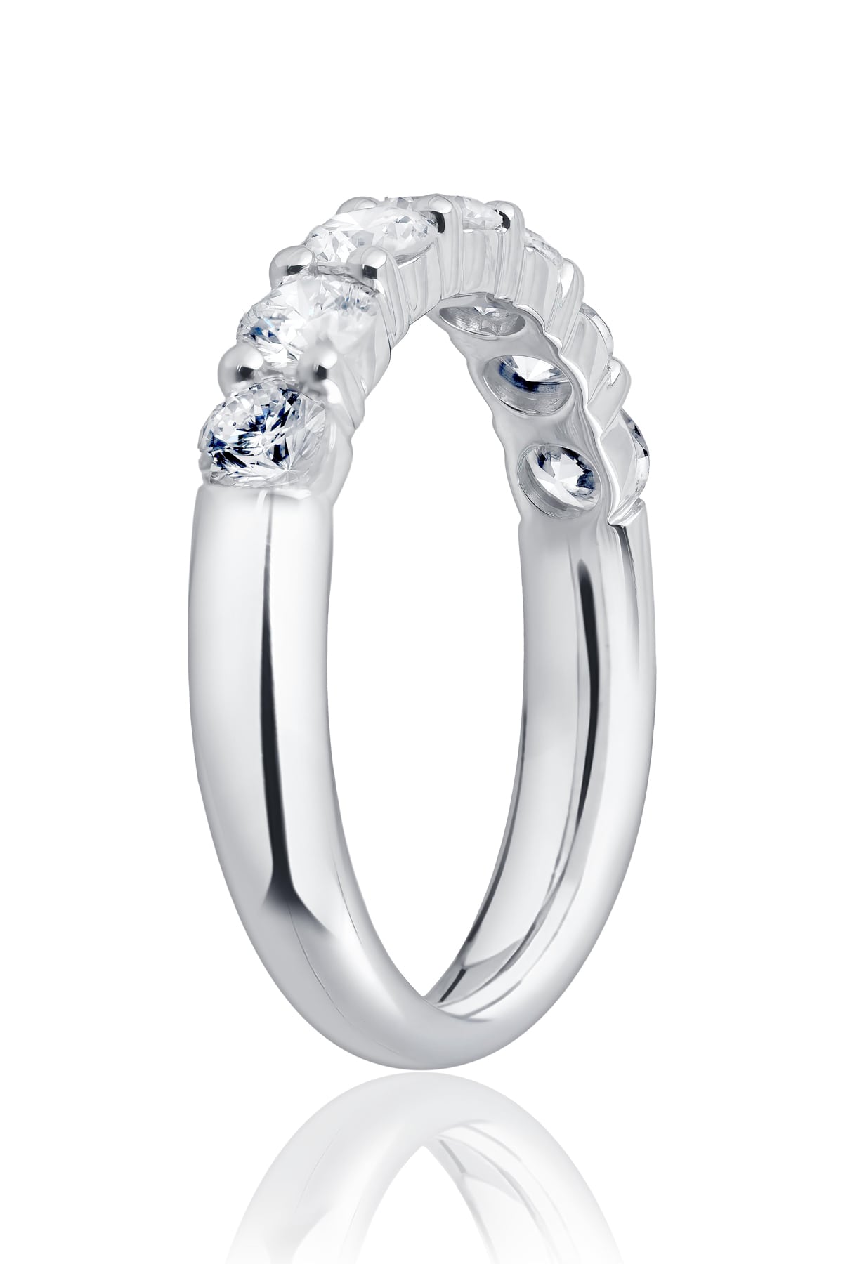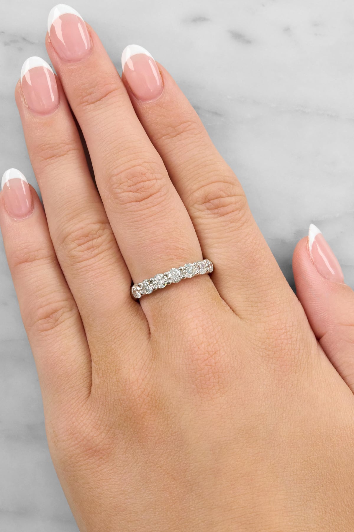 Elegant and timeless, this 18ct white gold wedding band showcases seven round brilliant cut diamonds totalling a stunning 1.20ct. Each diamond is beautifully secured in classic claw settings, allowing exceptional light play and maximum sparkle. With its refined profile and luxurious brilliance, this band is a perfect choice to celebrate enduring love.