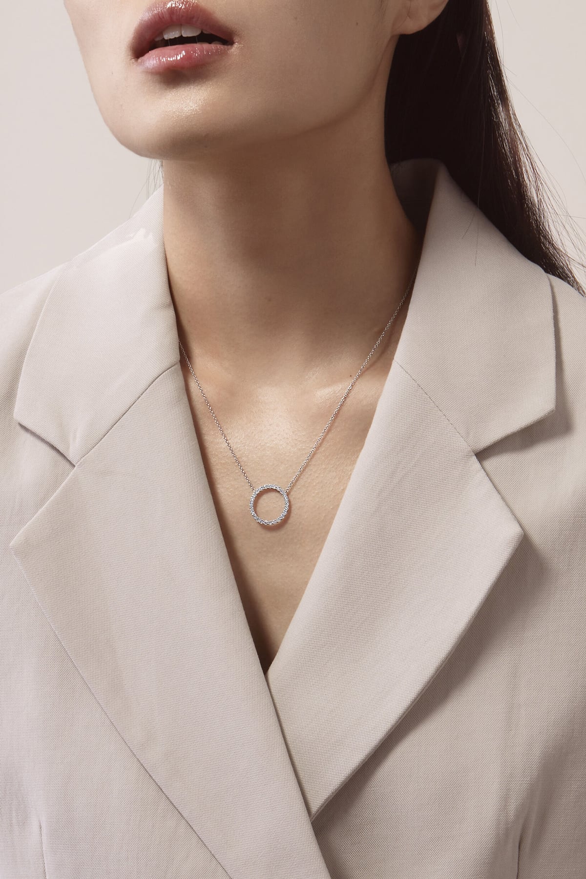 Necklace with a circular pendant worn by a person against a neutral background