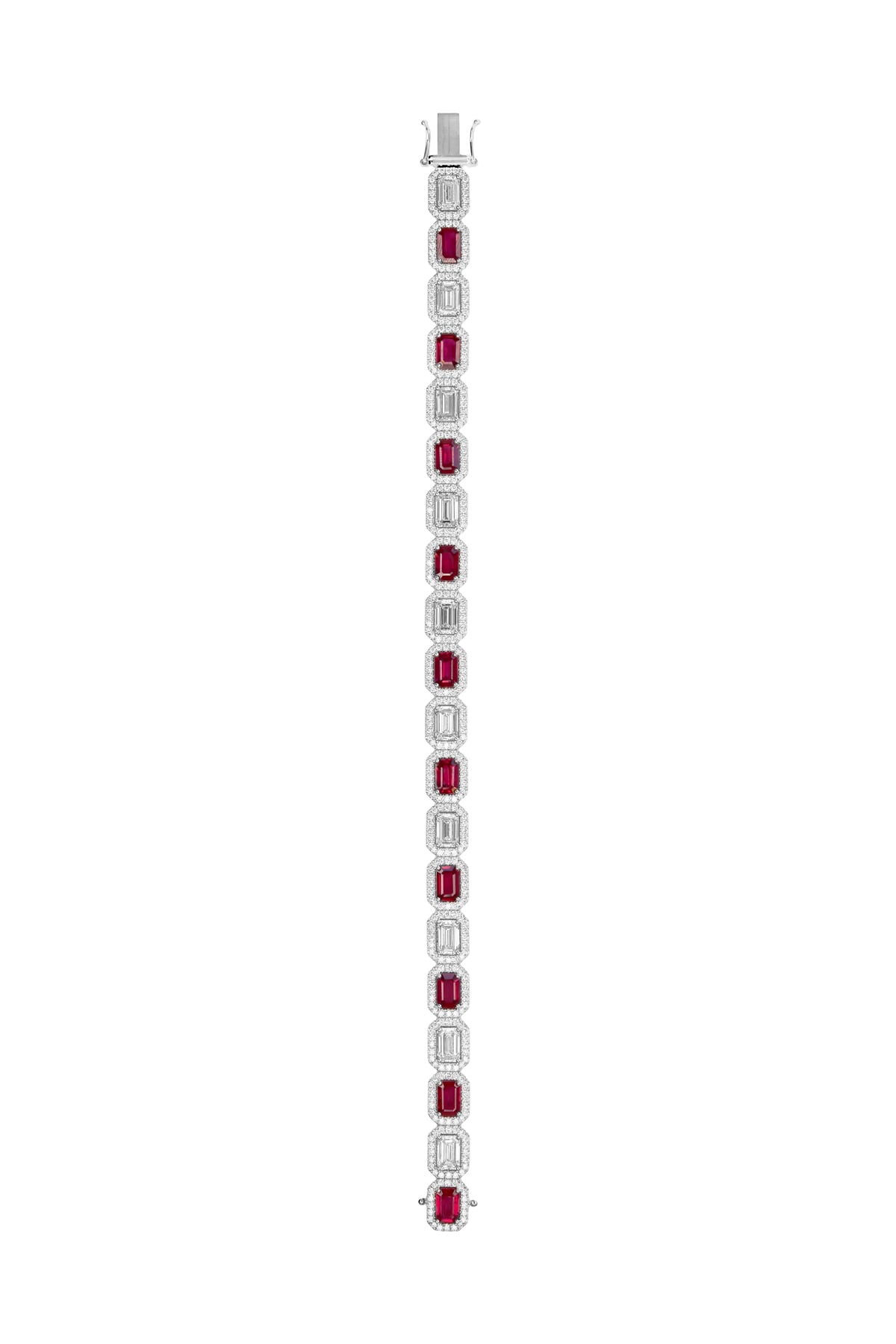 Striking and luxurious, this exceptional 18ct white gold bracelet showcases a bold interplay of rich colour and refined brilliance. Featuring ten vibrant natural rubies totalling 5.40ct, the design is elevated by a sophisticated diamond arrangement that includes ten emerald cut diamonds totalling 5.35ct, complemented by round brilliant cut diamonds adding a further 2.45ct. With diamonds graded F–G colour and VS clarity, this bracelet delivers extraordinary sparkle and presence, making it a true statement piece suited to the most special occasions.